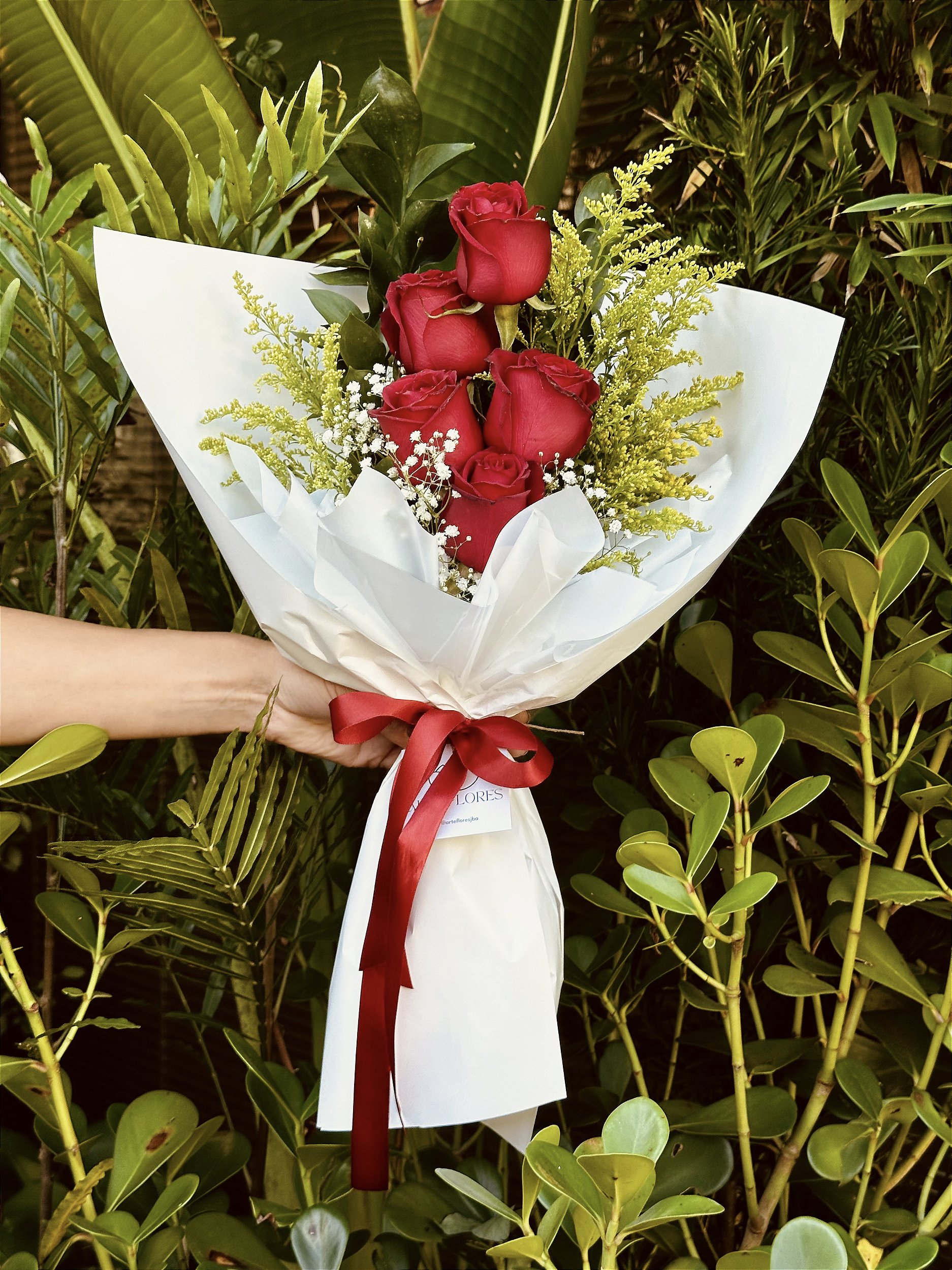 Moderna composição com 5 rosas nacionais, embrulhada com carinho em papel personalizado Arte Flores e amarrada com um sofisticado laço de cetim. Romântico e delicado, é perfeito para surpreender a pessoa amada.