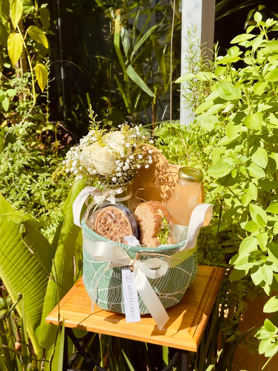 Para levar seu sentimento a uma pessoa especial! Este lindo kit com cesto garden, arranjo mix de flores, tábua bambu coração, sanduíche natural, tortinha doce e suco. Surpreenda com este lindo gesto e espalhe bons sentimentos.