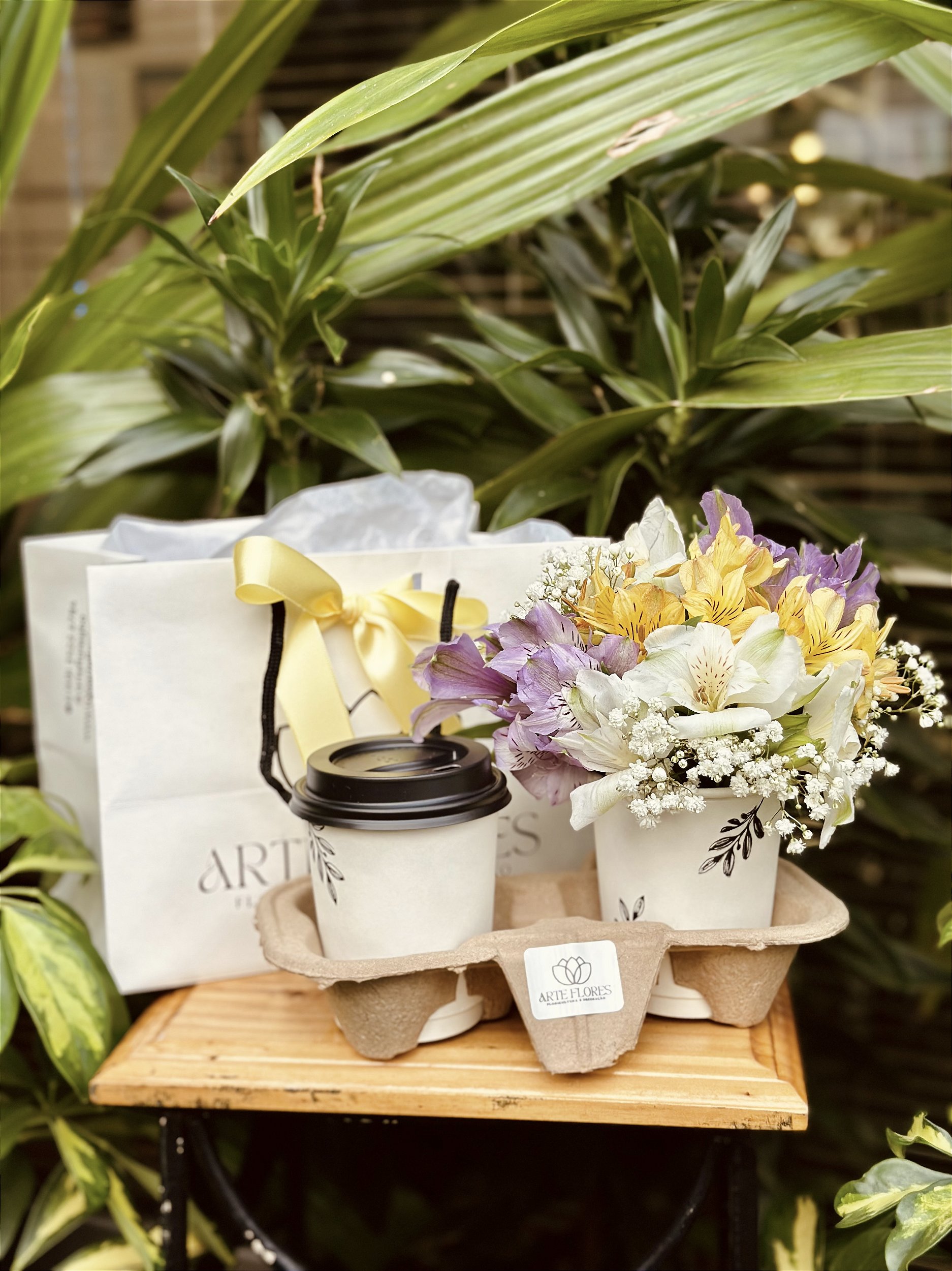 Para levar seu sentimento a uma pessoa especial! Este lindo kit com base para copos, arranjo colorido mini e café enviado em nossa sacola personalizada. Surpreenda com este lindo gesto e espalhe bons sentimentos.