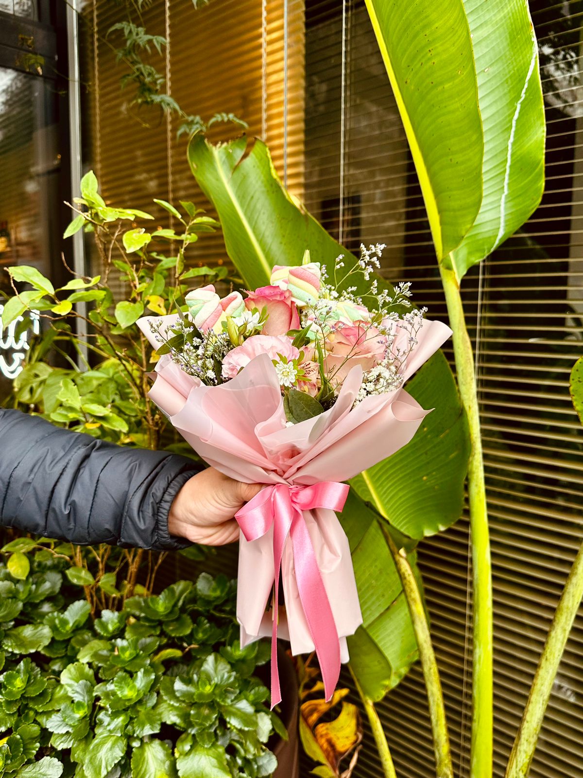 Uma composição com mix de lindas flores em vários tons. São flores nacionais, flores do campo e marshmallows em sua composição. Embalado com carinho, tradicionalmente encantador, pensado nas mini bailarinas.