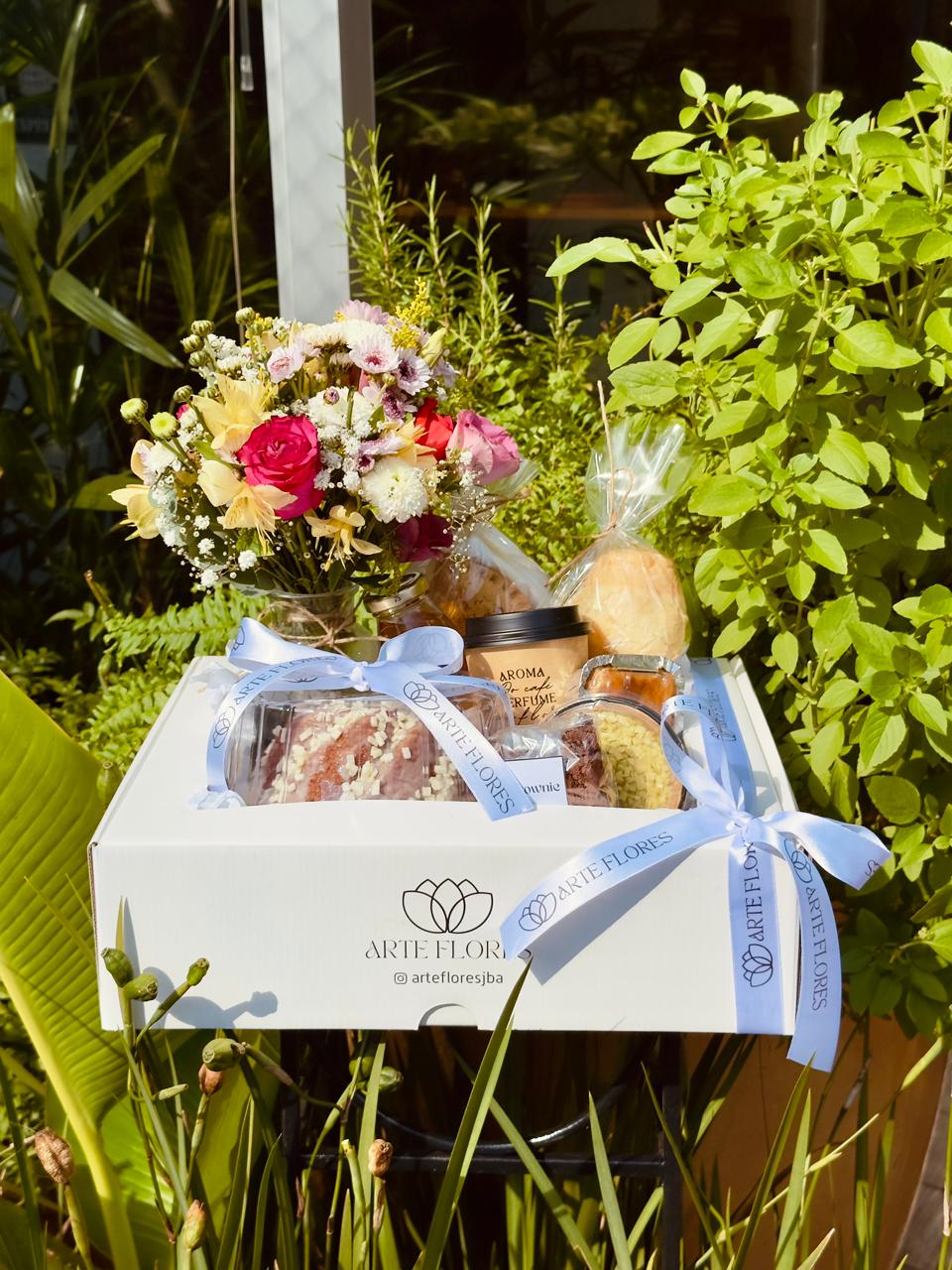 Para levar seu sentimento a uma pessoa especial! Este lindo kit com caixa personalizada Arte Flores, arranjo mix de flores, bolo mini, brownie, suco, pastel assado de nata, dois pães de queijo, empada, café espresso ou latte e mini tortinha doce. Surpreenda com este lindo gesto e espalhe bons sentimentos.