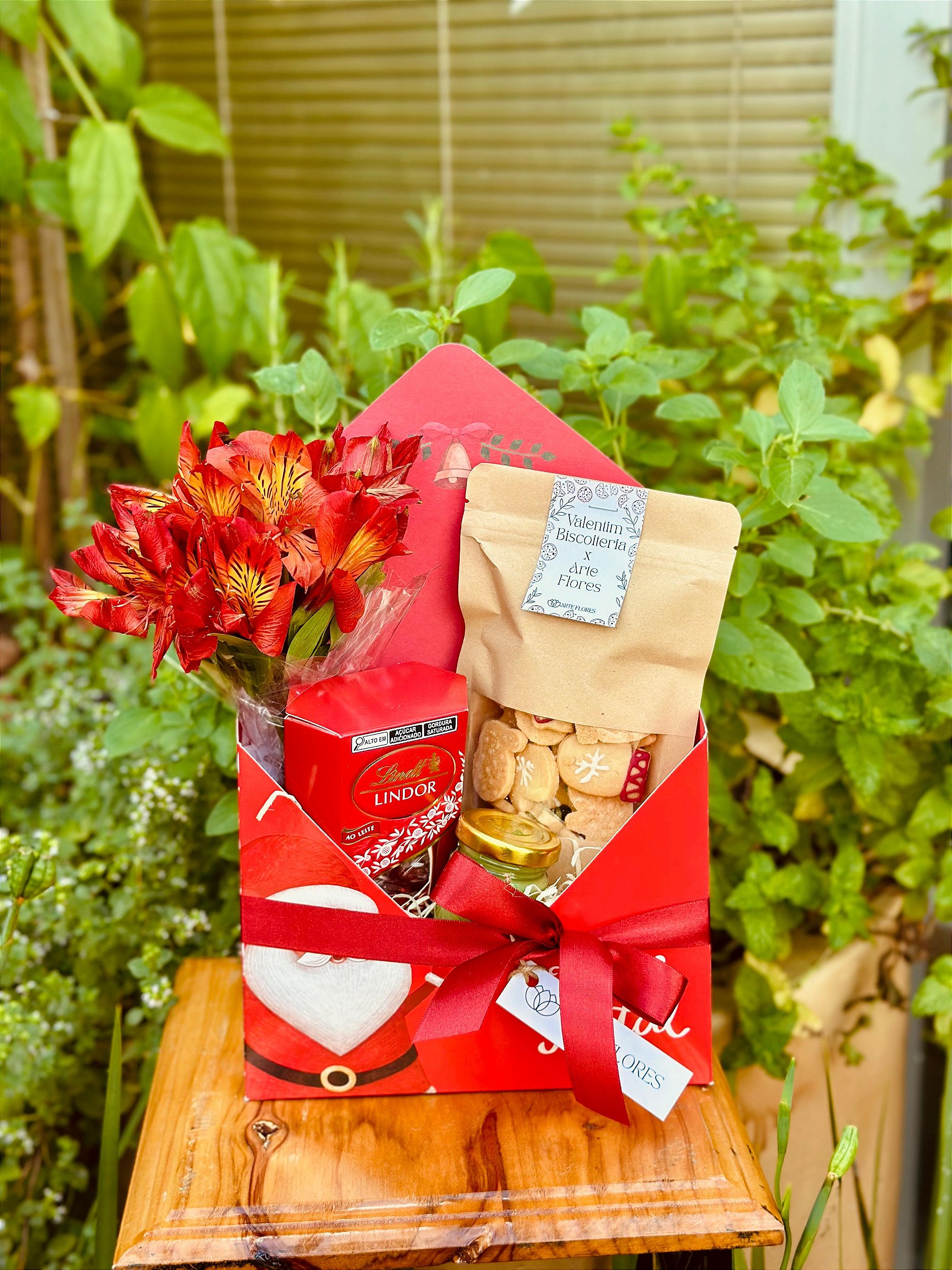 Para levar seu sentimento a uma pessoa especial neste Natal! Este lindo kit com caixa envelope, arranjo pequeno de alstroemérias, trufas lindt, drágea de biscoitos natal e mini pistache. Surpreenda com este lindo gesto e espalhe bons sentimentos.