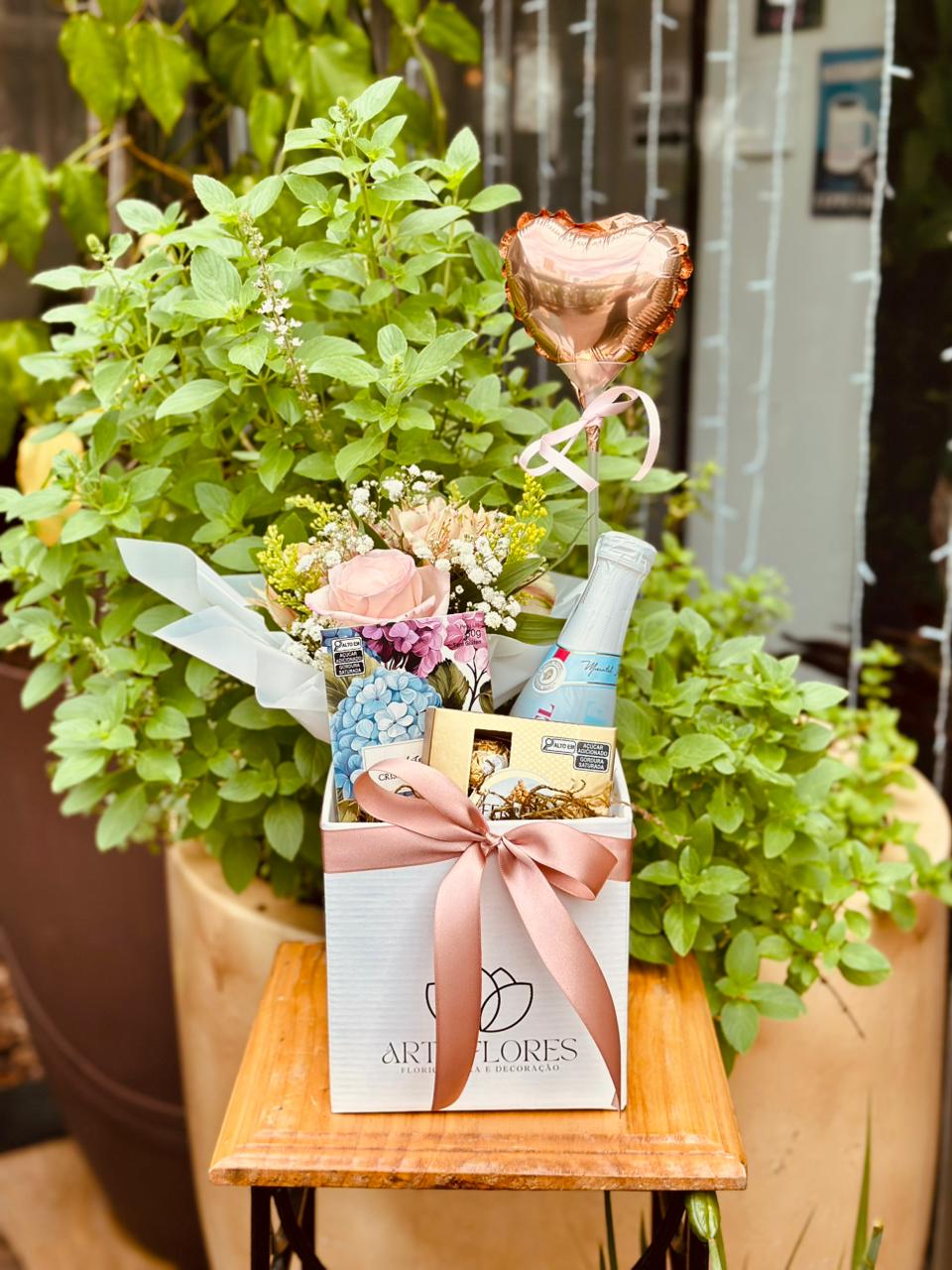 Para levar seu sentimento a uma pessoa especial neste final de ano! Este lindo kit com caixa arte flores, arranjo pequeno, ferrero rocher 4 unid, barra de chocolate arte cacau, mini espumante e balão mini coração.Surpreenda com este lindo gesto e espalhe bons sentimentos neste dia.