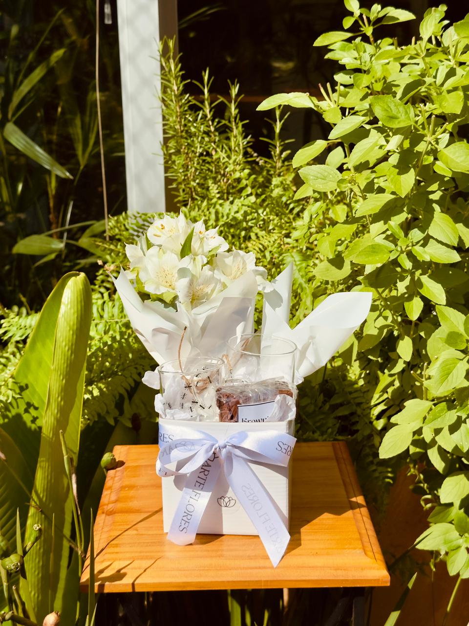 Para levar seu sentimento a uma pessoa especial! Este lindo kit com Caixa personalizada pequena, arranjo mix pequeno, xícara vidro mini, xícara vidro grande e brownie. Surpreenda com este lindo gesto e espalhe bons sentimentos.