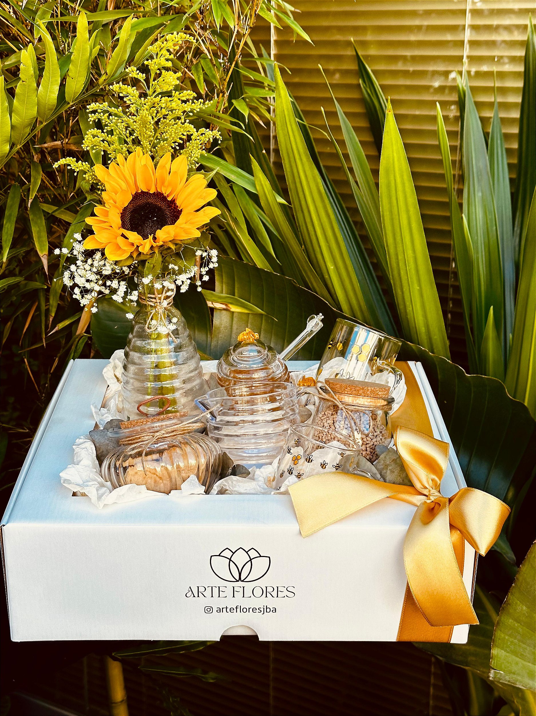 Para levar seu sentimento a uma pessoa especial! Este lindo kit com caixa personalizada Arte Flores, arranjo de girassol no vidro, vidro com biscoitos artesnais, jarra abelha, caneca abelha grande, caneca abelha pequena, meleira abelha com mel e vidro com chá. Surpreenda com este lindo gesto e espalhe bons sentimentos.