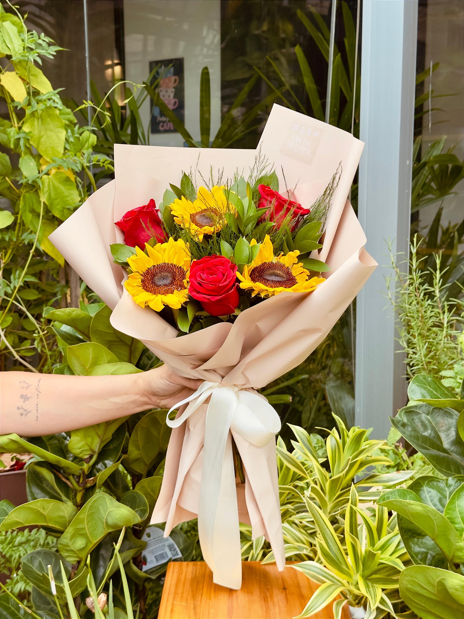 Este lindo buquê com combinação harmoniosa de 3 rosas e 3 girassóis e complementos delicados. Este presente será entregue em uma exclusiva embalagem Arte flores.