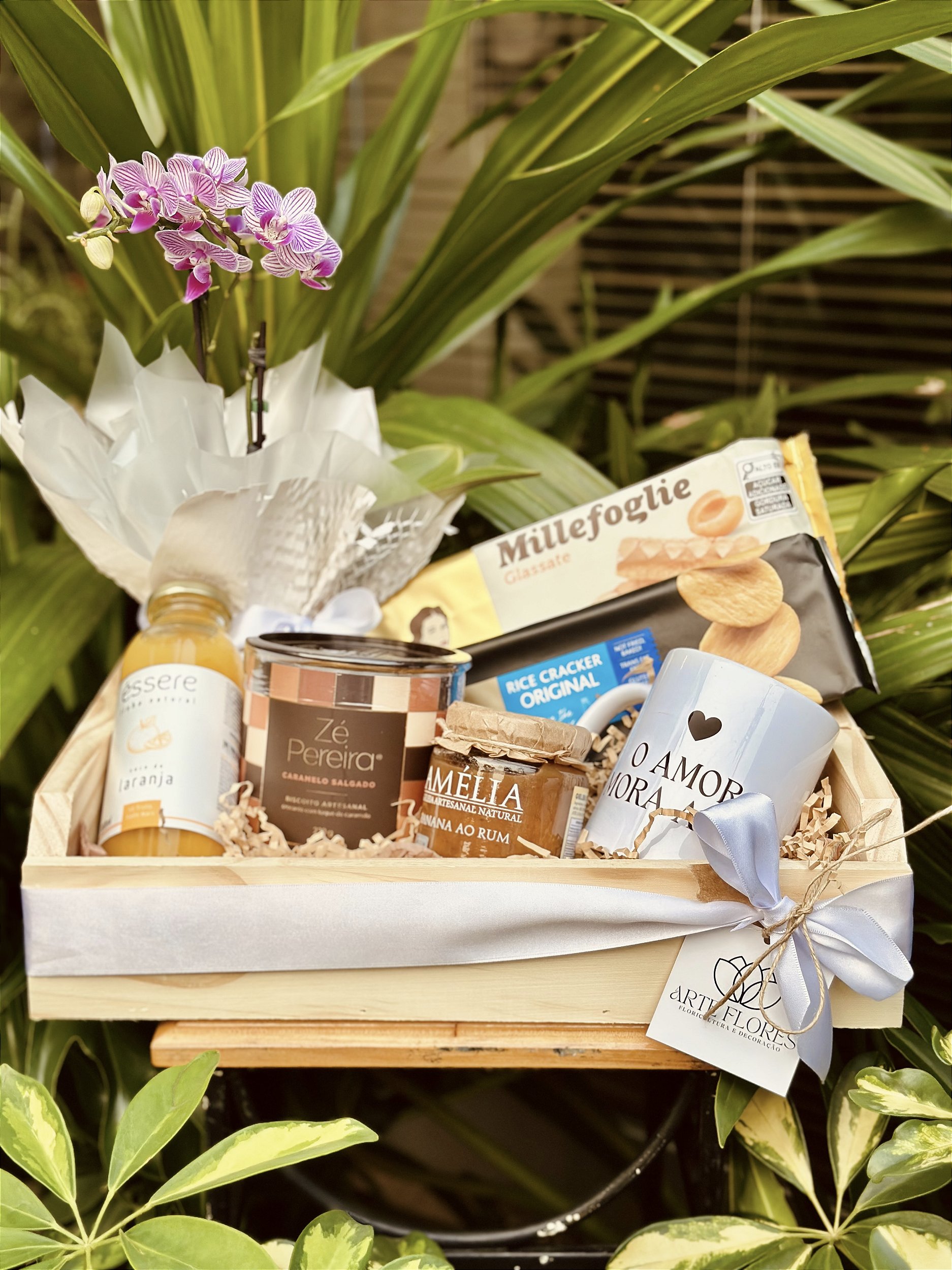 Para levar seu sentimento a uma pessoa especial! Este lindo kit com caixa de madeira, mini orquídea, biscoito recheado, snack de arroz, biscoito zé pereira, caneca arte flores, geléia, suco. Surpreenda com este lindo gesto e espalhe bons sentimentos.
