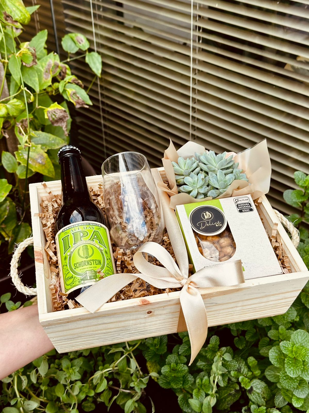 Para levar seu sentimento a uma pessoa especial! Este lindo kit com caixa de maderia, cerveja, copo, suculenta e castanhas. Surpreenda com este lindo gesto e espalhe bons sentimentos.