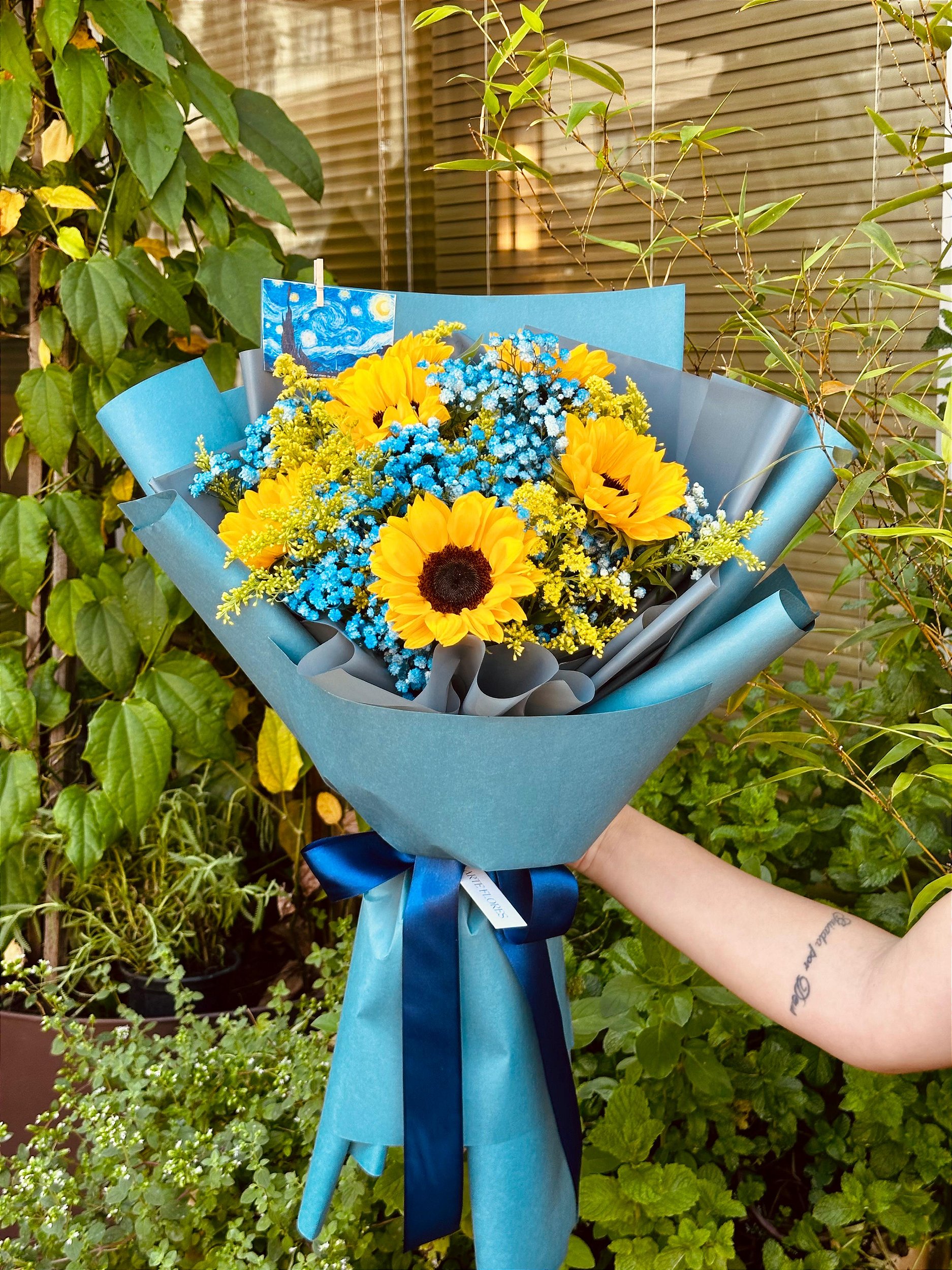 Um Buquê de girassóis desconstruído alegre e elegante composto por mix de girassóis e gypsophilas azuis. Este presente será entregue em uma exclusiva embalagem Arte flores e acompanhado com uma foto polaroid exclusiva dele.