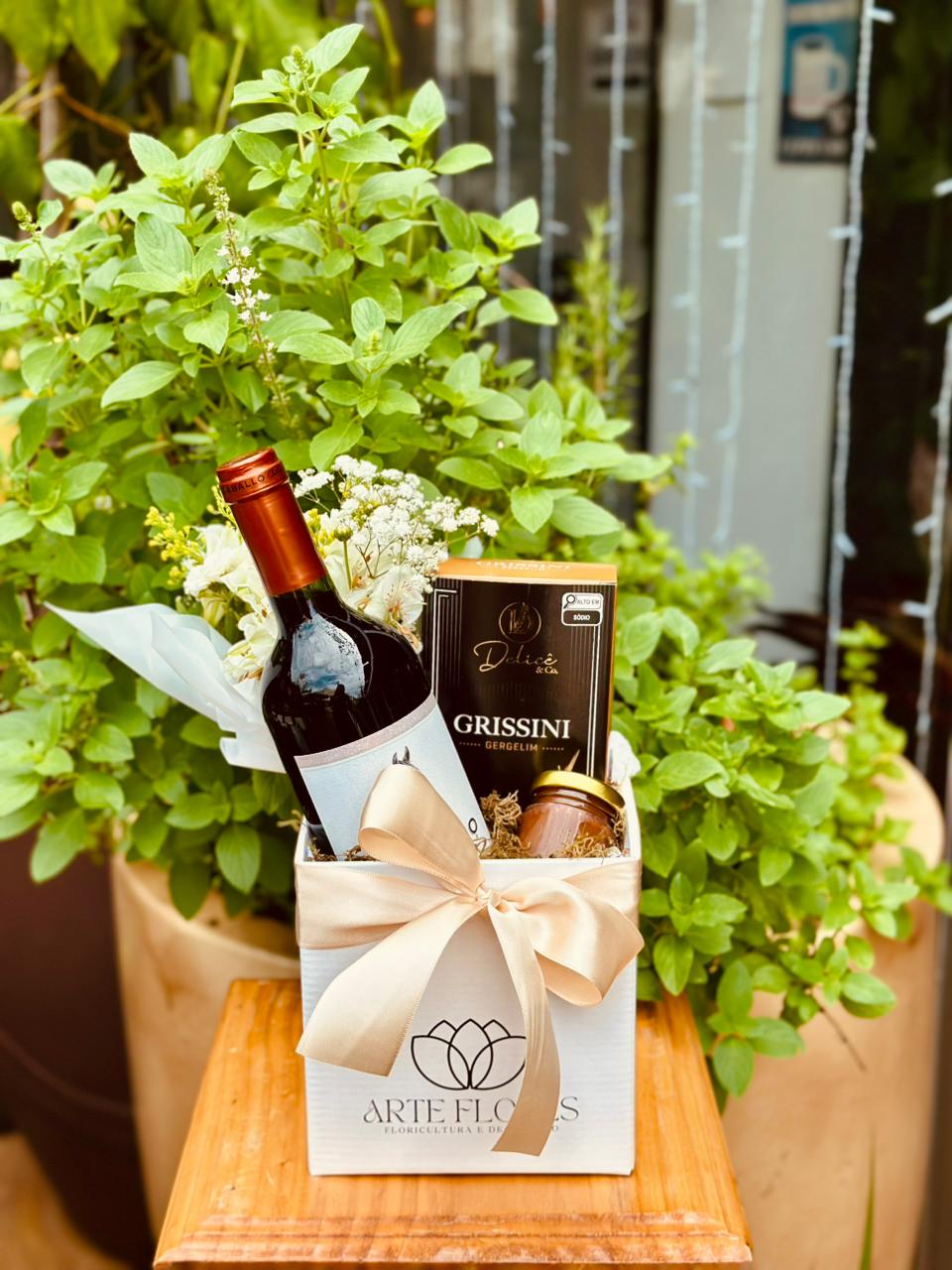 Para levar seu sentimento a uma pessoa especial neste final de ano! Este lindo kit com caixa arte flores, arranjo pequeno, vinho,vidro com nutella ou doce de leite e grissini. Surpreenda com este lindo gesto e espalhe bons sentimentos neste dia.