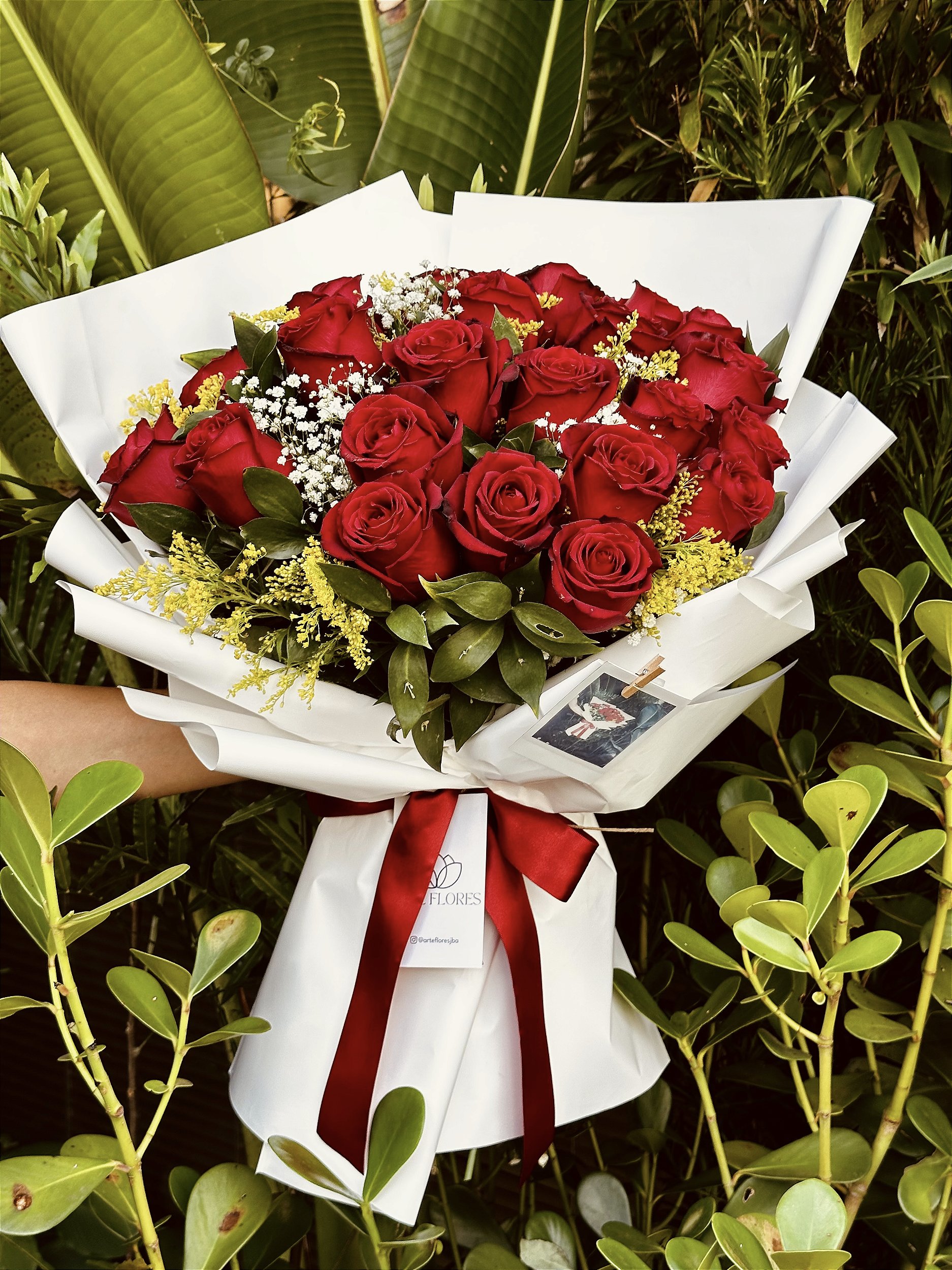 O clássico buquê para os românticos e apaixonados. O mais romântico dos buquês não tem esse nome à toa, são 24 lindas rosas nacionais envolvidas por folhas modernas e sofisticadas. Este presente será entregue em uma exclusiva embalagem Arte flores e acompanhado com uma foto polaroid exclusiva dele.